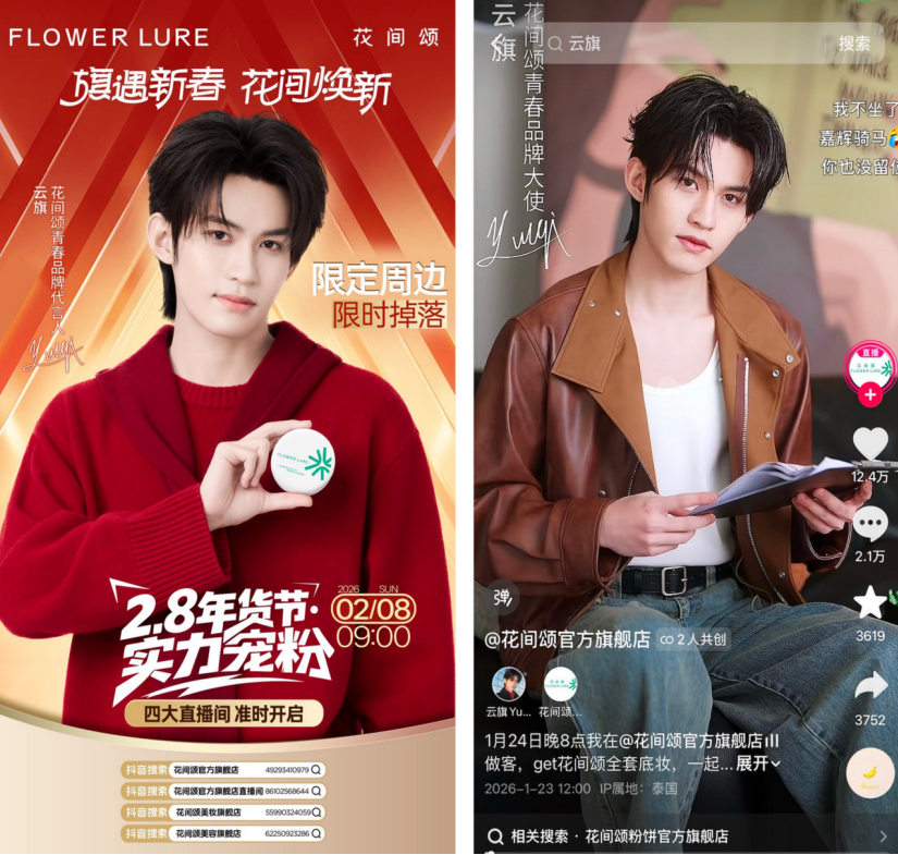在产品端,其通过“骏影驭光”马年限定粉饼强化“新年开运礼”属性;经营端,则通过深度绑定艺人云旗,将Slogan升级为“旗遇新春 花间焕新”,把明星影响力转化为价值表达。同时通过合作平台IP、联动四大直播间及全域媒介曝光,配合粉丝见面会与明星进播矩阵,花间颂实现了从预热到爆发的全链路打通,驱动明星进播当天GMV爆发超1200%,成交人群中预热人群占比达77%,粉丝成交占比52%,实现了生意结构优化与新客群的高效转化。