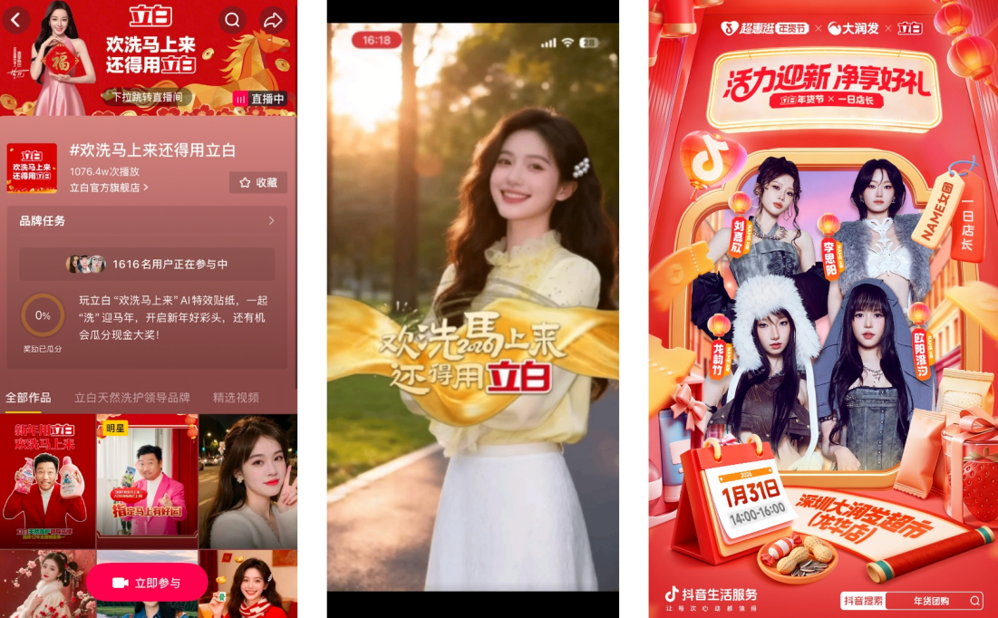 以「立白」为例,商家携手抖音生活服务IP《年货好逛节》,将家务劳动重塑为一场治愈社交。