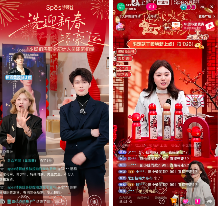 其次是「内容放大」。借助明星达人、平台IP及短剧等多元形态,商家正在将年货商品重塑为社交话题。例如,「巴黎欧莱雅」通过主题曲与短剧打造国民级话题,「法国科兰黎」与「清扬」通过明星直播大场深化心智认同,「荣耀」跨界合作时尚媒体《时尚芭莎》实现高审美人群渗透,「DR.WU达尔肤」则借助抖音华彩传承晚会完成文化情绪渗透,「Spēs诗裴丝」更是通过热播短剧联动强化了“体面社交”的应节寓意。