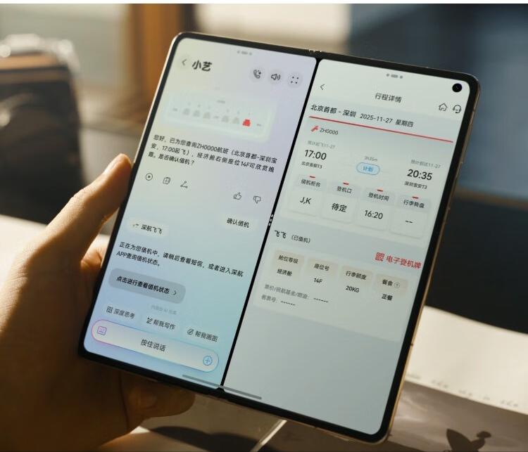 小艺智能体的升级也很实用。A2A智能体协作技术能联动多个APP,比如对小艺说“帮我订后天去深圳的靠窗机票”,它会直接调用航司APP筛选航班,还能自动提醒值机时间并跳转选座。分屏协作时,一边用浏览器查资料,一边用备忘录记笔记,窗口大小能自由调节,效率比直板机提升一倍。