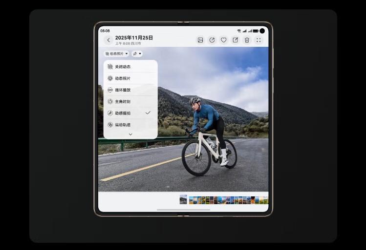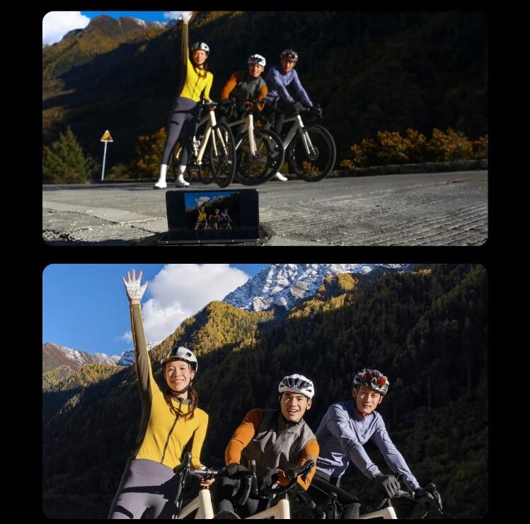 折叠形态还带来了独有的拍摄玩法:悬停拍摄时把手机折成90度放在桌面上,就能自动触发延时摄影,拍日落或车流完全不用三脚架;后置自拍时,被拍者能通过外屏实时看到构图,再也不用喊“往左一点”“再高一点”了。对vlog博主来说,“一拍多得”功能更是神器,拍一张照片能后续编辑出虚拟光圈、闪拍等多种效果,省了大量后期时间。