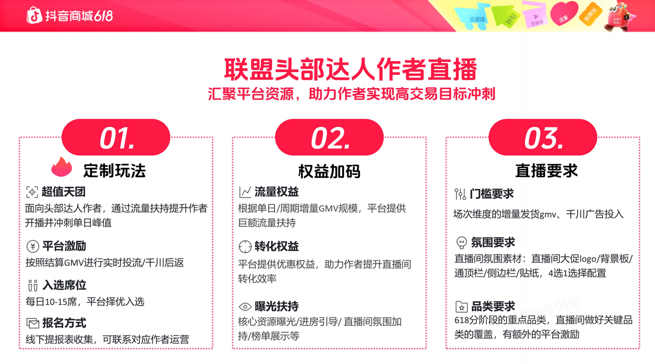 在直播和短视频方面,「超值天团」面向头部达人,按GMV增量与千川投入给予流量及核心资源曝光,助力冲刺交易峰值;「行业垂类直播」则覆盖更广泛的垂类达人与商家,通过流量激励和曝光资源,鼓励作者结合520、世界杯、端午节等节点进行特色内容创作。此外,挂车短视频与直播引流短视频激励玩法,帮助商家完整覆盖大促期的短视频经营链路,为直播间高效蓄水、引爆成交。