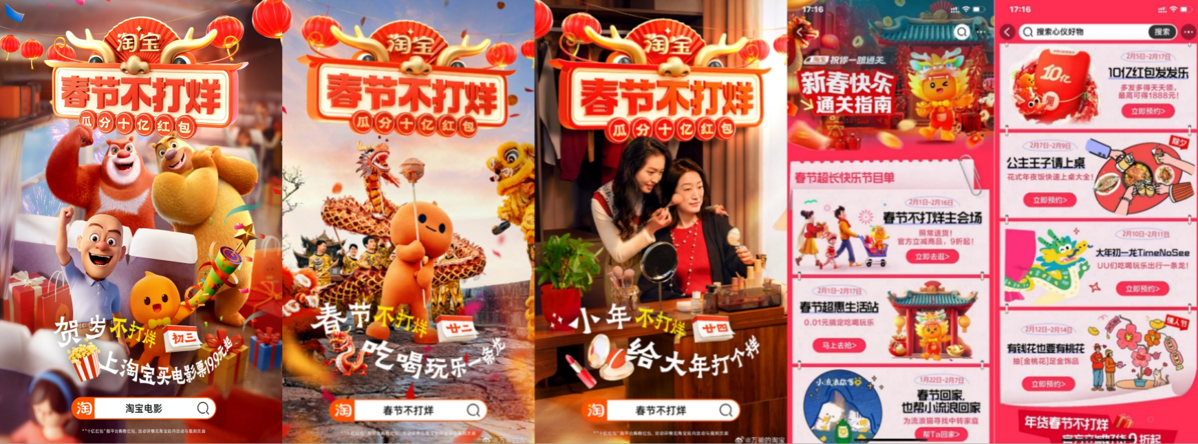 淘宝特别推出“春节超长快乐节目单”,呈现如#公主王子请上桌#、#大年初一龙TimeNoSee#、#有钱花也要有桃花#等多个创意节日特辑,提供了更多样化的“淘宝式过年”内容给到消费者,以趣味内容设置陪伴用户在淘宝度过好逛、好买、好玩、好看、好福利的龙年新春。强化了淘宝陪你过节的心智,也引领了春节消费的新风向。